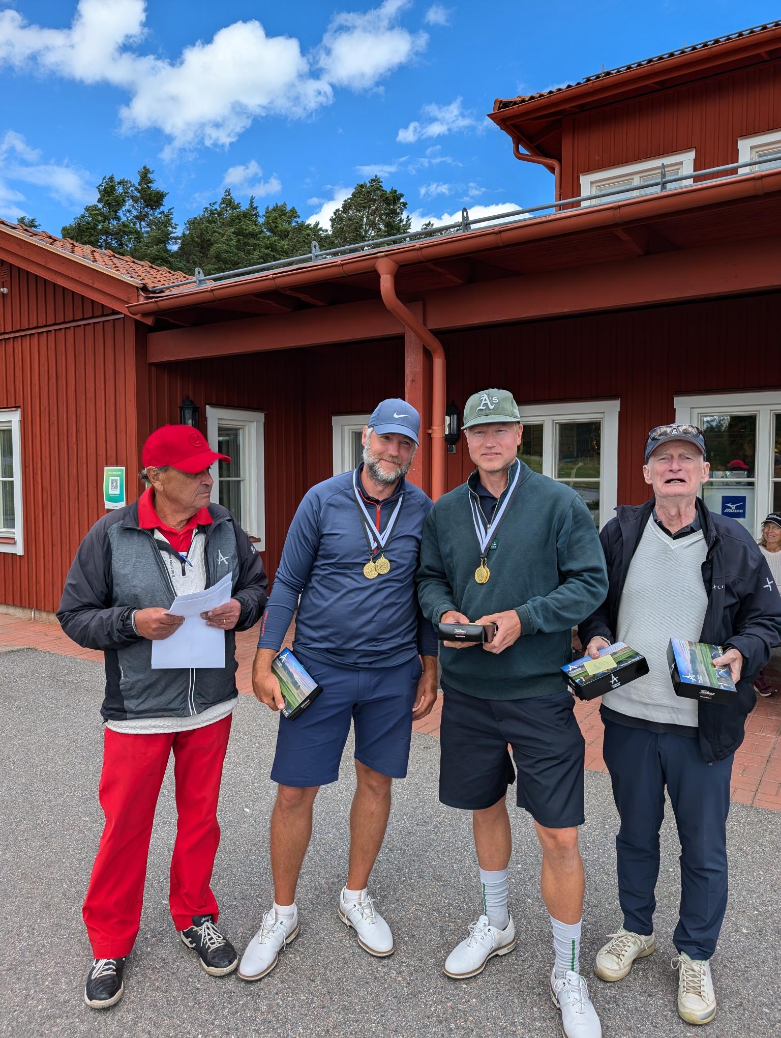 Klass A 1 - Peter A 67 Brutto 79 2 - Thomas B 70 3 - Ulf J 71 Brutto 79 Klass B 1 - Stig M 66 2 - Leif L 67 3 - Jan L 70 Närmast hål på 2 slag, hål 12, från tee 45: A: Bosse B: Lennart W Närmast hål på 1 slag, hål 13, från tee 49: A: Inge B:...